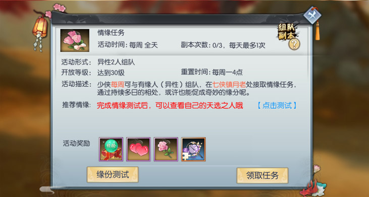 来分配CP啦!新增缘分测试,玩家可以通过缘分测试,根据系统匹配推荐情缘角色。点击查看详情。